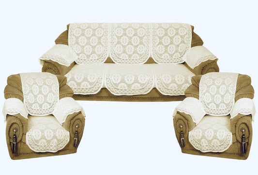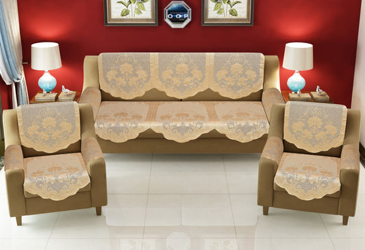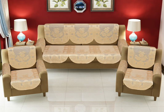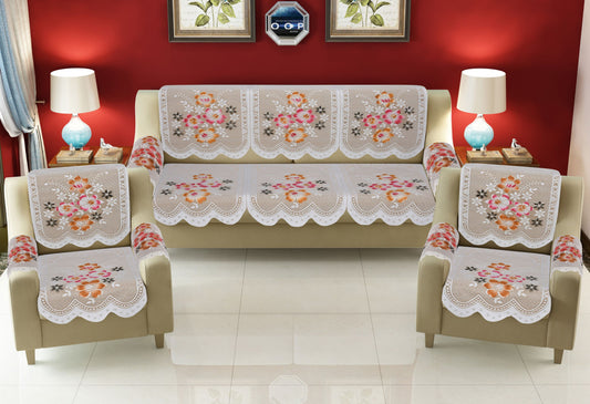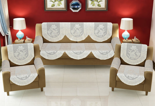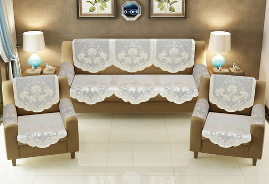 Bigger Fish Poly Cotton Net Fabric Floral Design 5 Seater Sofa Cover with 6 Pcs Arms Cover - 16 Pieces (Cream)