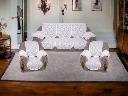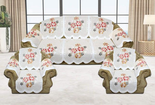 Bigger Fish Poly Cotton Net Fabric Floral Design 5 Seater Sofa Cover with 6 Pcs Arms Cover - 16 Pieces (White)