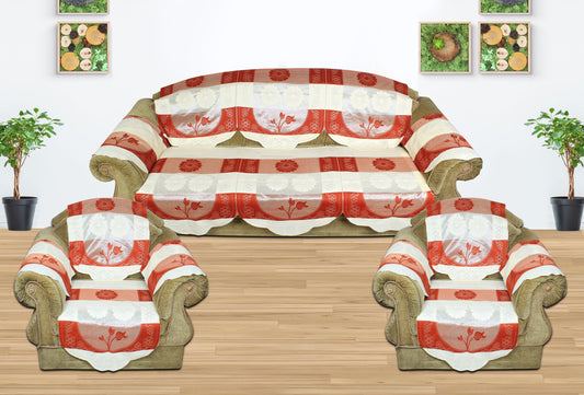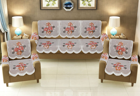 Bigger Fish Poly Cotton Net Fabric Floral Design 5 Seater Sofa Cover with 6 Pcs Arms Cover - 16 Pieces (Rust)