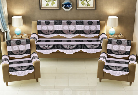 Bigger Fish Poly Cotton Net Fabric Floral Design 5 Seater Sofa Cover with 6 Pcs Arms Cover - 16 Pieces (Black)
