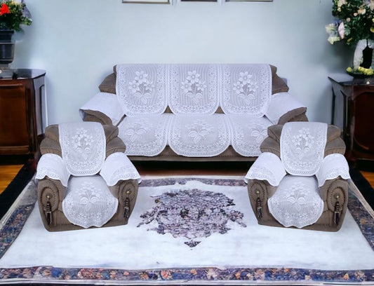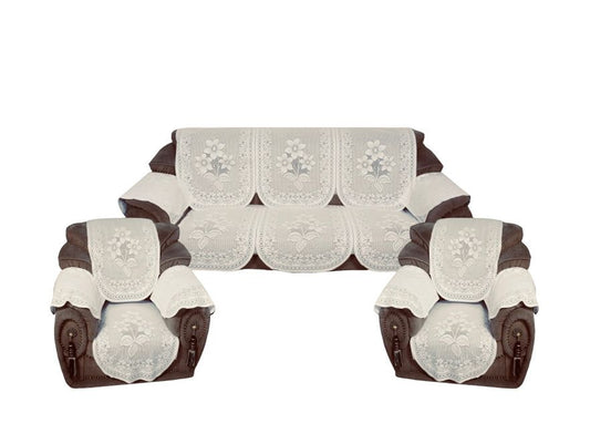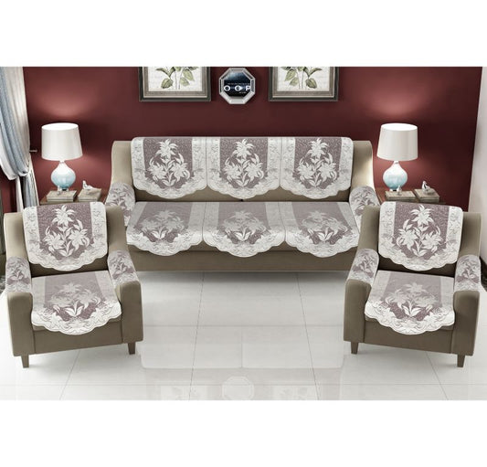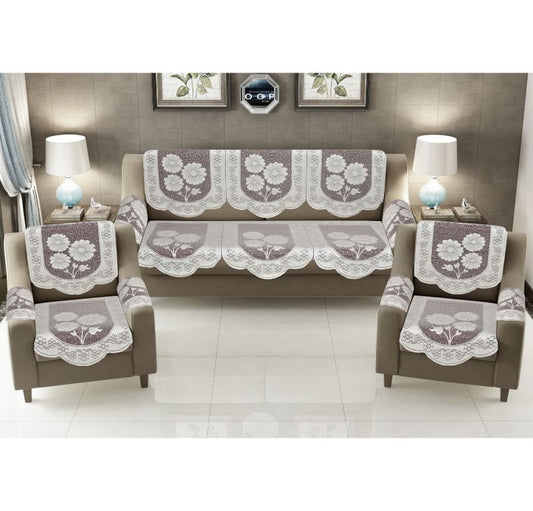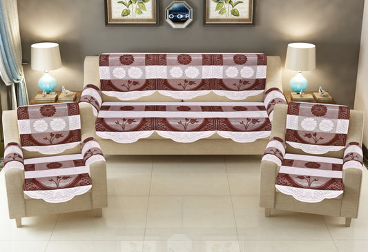 Bigger Fish Poly Cotton Net Fabric Floral Design 5 Seater Sofa Cover with 6 Pcs Arms Cover - 16 Pieces (Brown)