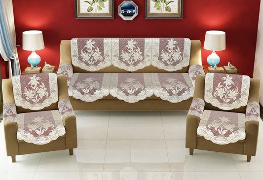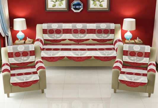 Bigger Fish Poly Cotton Net Fabric Floral Design 5 Seater Sofa Cover with 6 Pcs Arms Cover - 16 Pieces (Maroon)