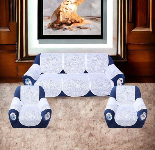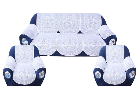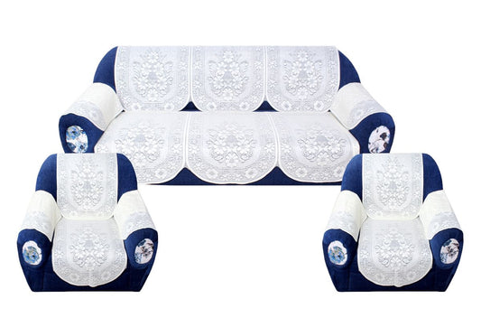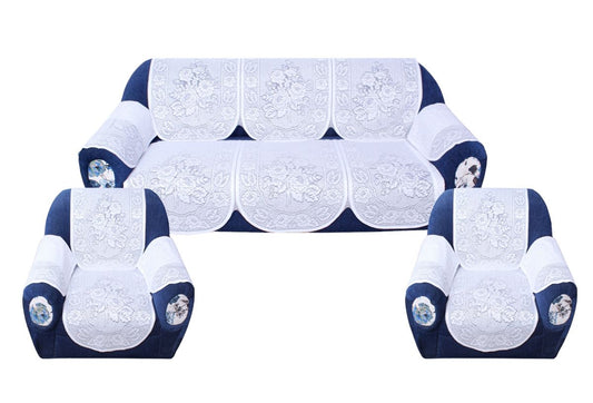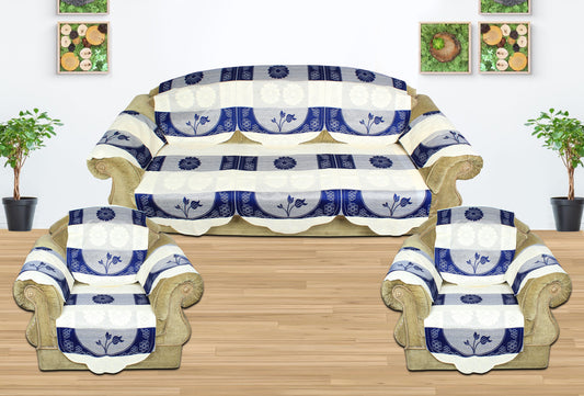 Bigger Fish Poly Cotton Net Fabric Floral Design 5 Seater Sofa Cover with 6 Pcs Arms Cover - 16 Pieces (Blue)