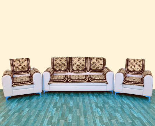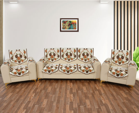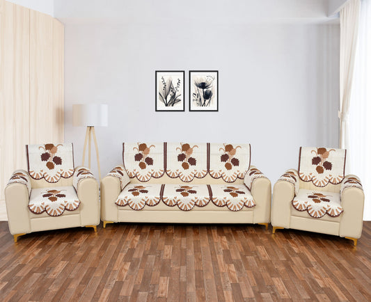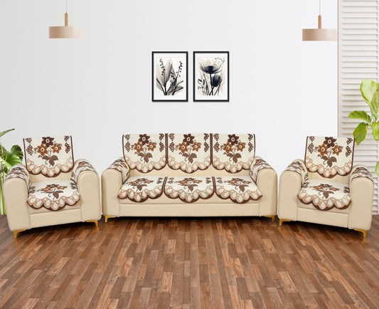 Bigger Fish Poly Cotton Net Fabric Floral Design 5 Seater Sofa Cover with 6 Pcs Arms Cover - 16 Pieces (Brown)
