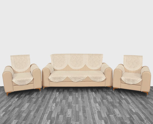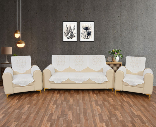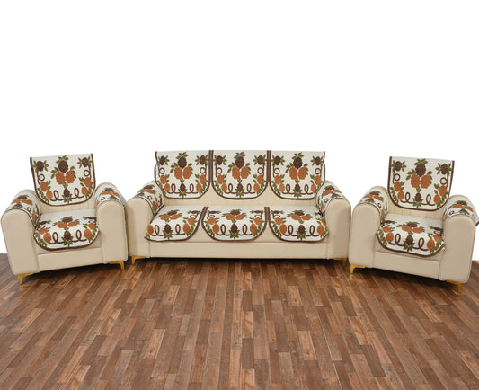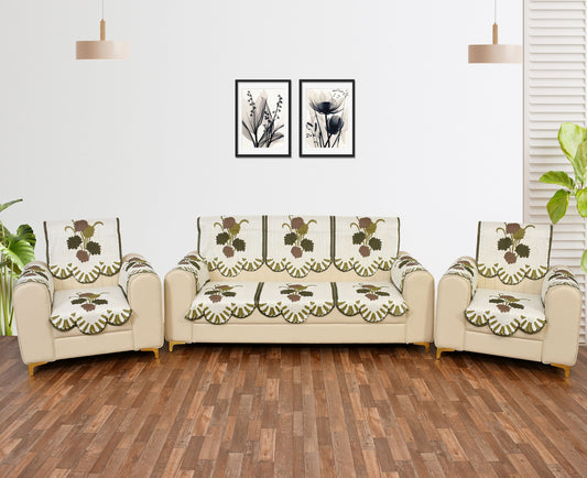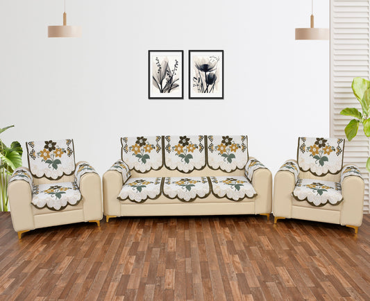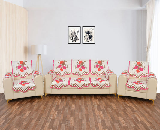 Bigger Fish Poly Cotton Net Fabric Floral Design 5 Seater Sofa Cover with 6 Pcs Arms Cover - 16 Pieces (Cream)