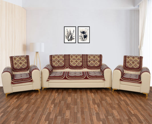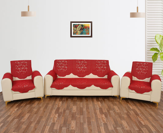 Bigger Fish Poly Cotton Net Fabric Floral Design 5 Seater Sofa Cover with 6 Pcs Arms Cover - 16 Pieces (Maroon)
