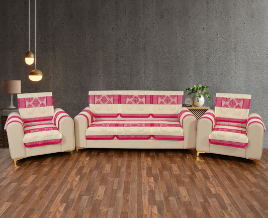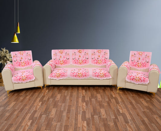 Bigger Fish Poly Cotton Net Fabric Floral Design 5 Seater Sofa Cover with 6 Pcs Arms Cover - 16 Pieces (Pink)