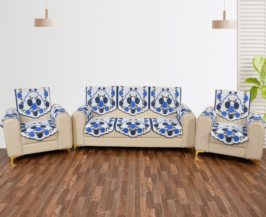 Bigger Fish Poly Cotton Net Fabric Floral Design 5 Seater Sofa Cover with 6 Pcs Arms Cover - 16 Pieces (Blue)