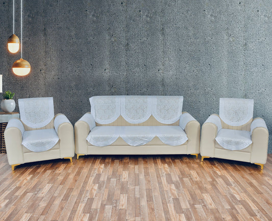 Bigger Fish Poly Cotton Net Fabric Floral Design 5 Seater Sofa Cover with 6 Pcs Arms Cover - 16 Pieces (White)