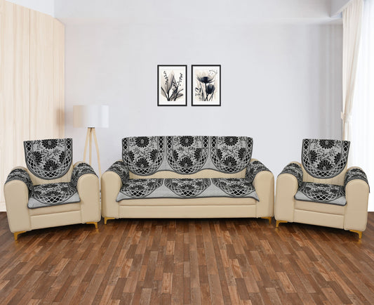 Bigger Fish Poly Cotton Net Fabric Floral Design 5 Seater Sofa Cover with 6 Pcs Arms Cover - 16 Pieces (Black)