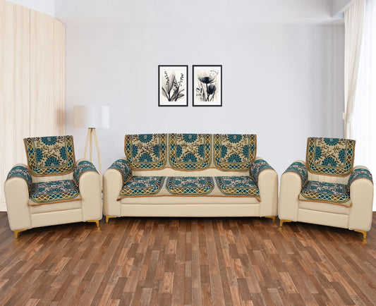 Bigger Fish Poly Cotton Net Fabric Floral Design 5 Seater Sofa Cover with 6 Pcs Arms Cover - 16 Pieces (Green)
